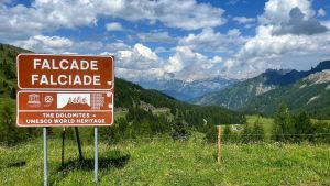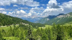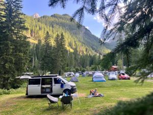 Langsam wird es hügeliger und es erheben sich die herrlichen Berge der Dolomiten vor uns. Am Marmolada stehen wir auf einem herrlichen Platz zwischen vielen Wanderern. Leider ist plötzlich eine mehrere Tage anhaltende Regenfront vorhergesagt, welche uns unsere Berg-Pläne über den Haufen werfen lässt…